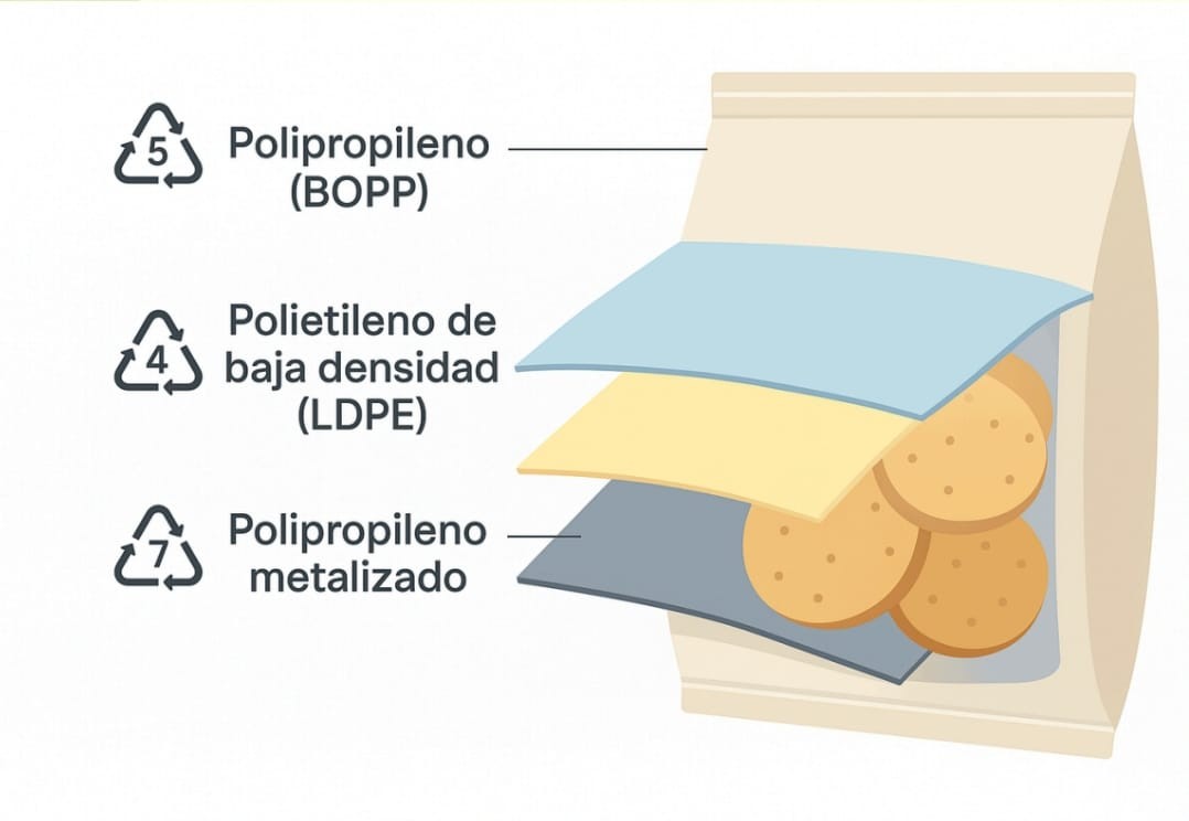 - PP (Capas de bolsas plásticas) - Polipropileno - : Resiste al calor, ligero, traslucido y duro. Reciclable; pero poco rentable; contamina fácilmente.